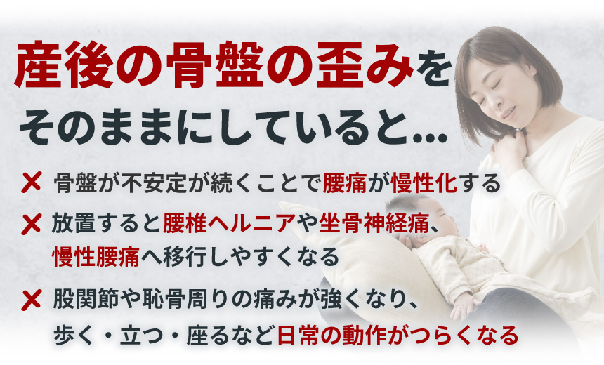 妊娠・出産によって骨盤周りの靭帯がゆるみ、さらに抱っこや授乳など前かがみ姿勢が続くことで、骨盤が正しい位置に戻りにくくなります。